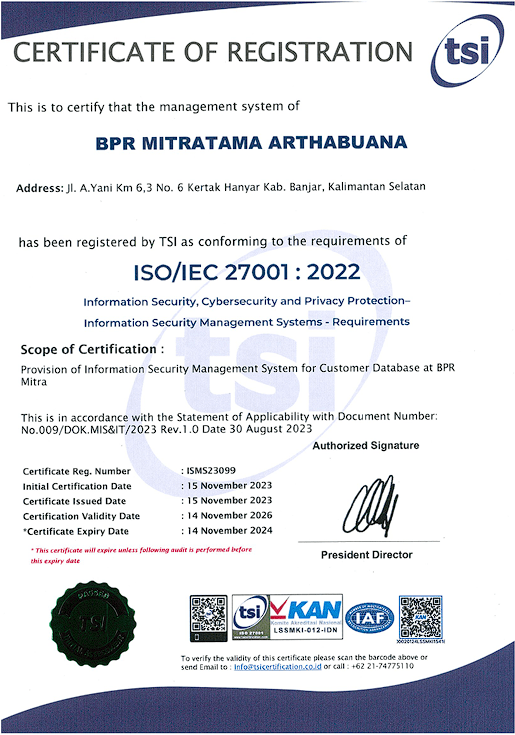 Bank Perkreditan Rakyat Mitratama Arthabuana (Bank Mitra) yang merupakan salah satu Bank Perkreditan Rakyat yang ada di Kalimantan Selatan, dan telah beroperasi sejak tanggal 1 Maret 1991 sampai sekarang berdasarkan Keputusan Menteri Keuangan Republik Indonesia Nomor : Kep- 038/KM.13/1991 Tahun 1991 dan Surat Keputusan Menteri Keuangan Nomor : Kep-252/KM.17/1995 Tahun 1995 tentang perubahan nama. Dimana saat mulai beroperasional tahun 1991 dengan nama PT. BPR Taufiq Artha Banua yang kemudian diubah menjadi PT. BPR Mitratama Arthabuana (Bank Mitra).